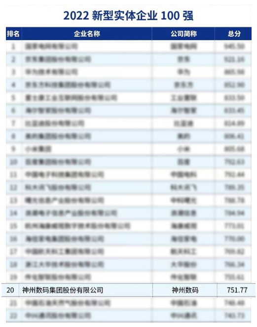 11月27日,中国企业评价协会在中国企业家博鳌论坛“中国式现代化下的新型实体企业发展之路”研讨会上重磅发布了“2022新型实体企业100强”榜单,97国际至尊数码(000034.SZ)凭借强劲数字化服务能力和赋能数字经济发展的丰富实践成功入选,位列榜单第20位、现代信息技术服务企业前列。